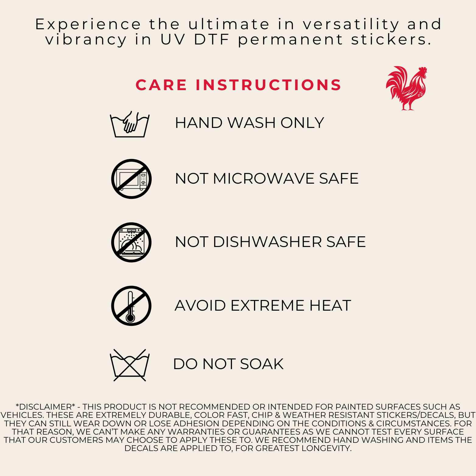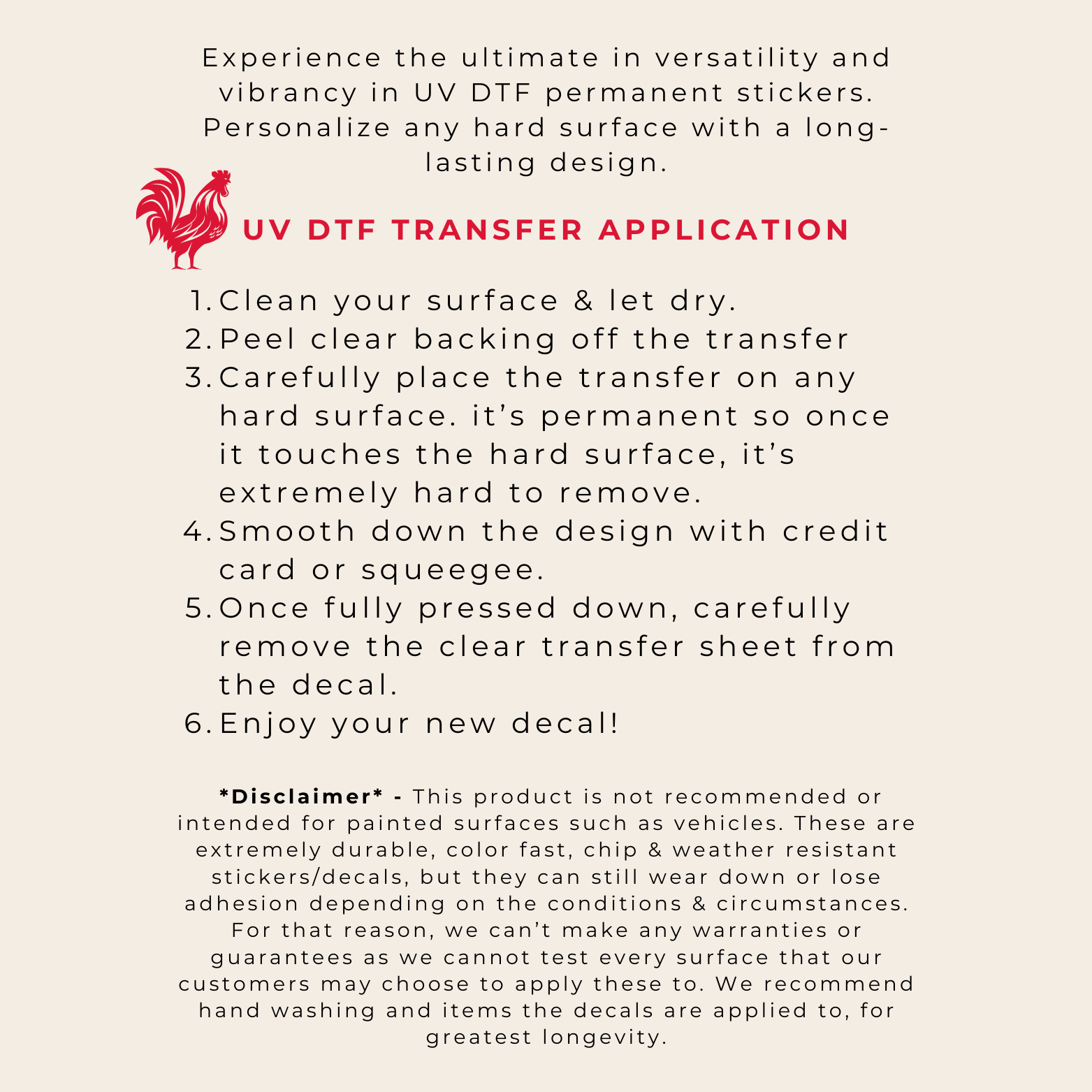 DO NOT ORDER UV DTF & REGULAR DTF ON THE SAME ORDER UNLESS YOU ARE OK WITH A LONGER TURNAROUND TIME. We do not print UV DTF as quickly as regular DTF. Also, our volume isn't as much for UV DTF, so we will not always run that printer every day.